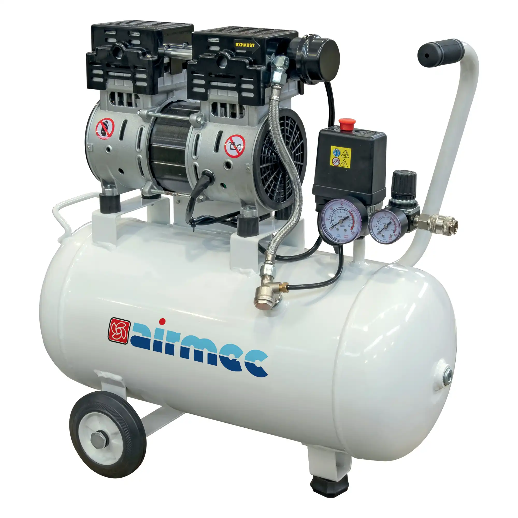 Compressore silenziato carrellato completo di maniglia e di ruote, per un facile spostamento. Funzionamento automatico comandato da pressostato e valvola di ritegno. Dotato di strumenti di controllo: manometri, valvola di sicurezza, riduttore di pressione con rubinetto portagomma. Oil Free.